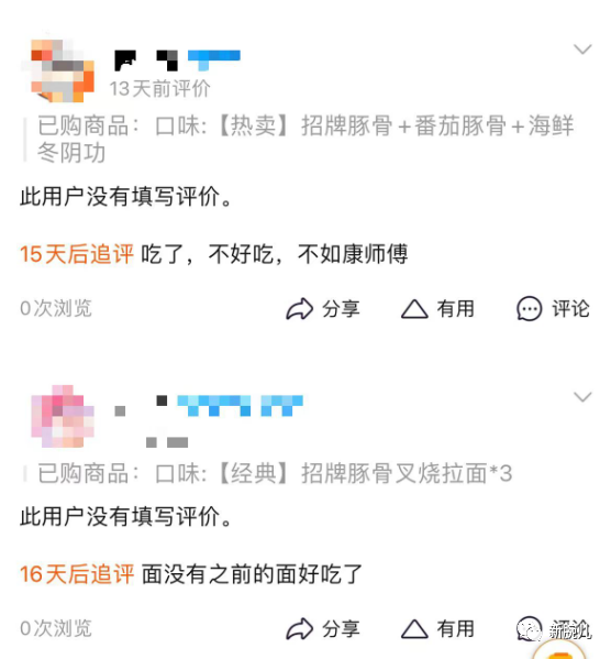 再看淘寶上,也有不少用戶評價“吃了,不好吃,不如康師傅”、“面沒之前好吃了”……