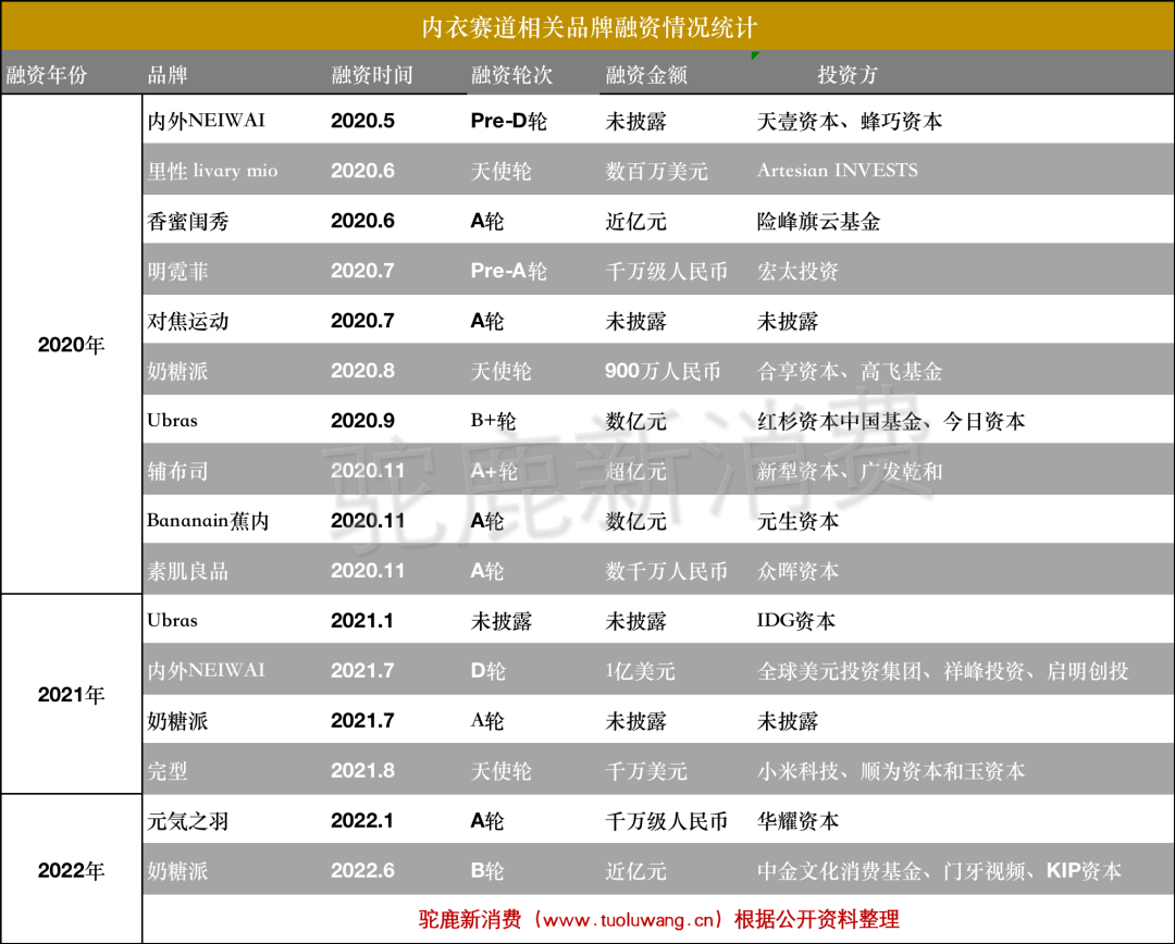 據(jù)駝鹿新消費(fèi)不完全統(tǒng)計(jì),最近三年,國內(nèi)內(nèi)衣賽道共發(fā)生16起融資事件,從已披露的融資金額來看,幾乎每起都動(dòng)輒千萬。在資本的推動(dòng)和精準(zhǔn)的營銷下,眾多新銳品牌在消費(fèi)市場破圈而出,如Ubras、內(nèi)外、奶糖派等。