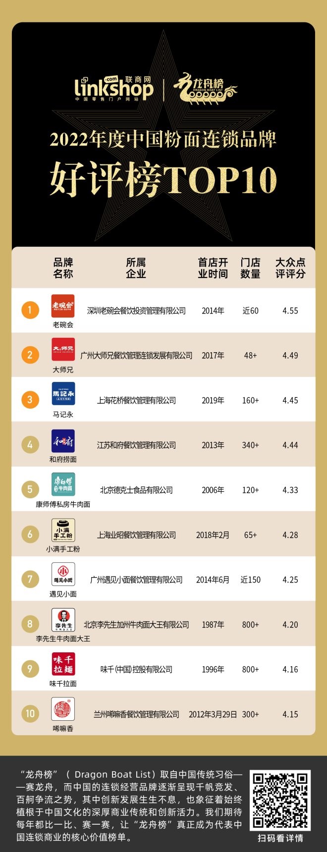 本期,《聯(lián)商網(wǎng)》特別推出龍舟榜之“2022年度中國粉面連鎖品牌TOP30”,從門店數(shù)據(jù)、消費者滿意度、市場融資情況等維度窺視各大品牌的發(fā)展情況和經(jīng)營情況,以及粉面行業(yè)呈現(xiàn)的發(fā)展特征及未來空間。
