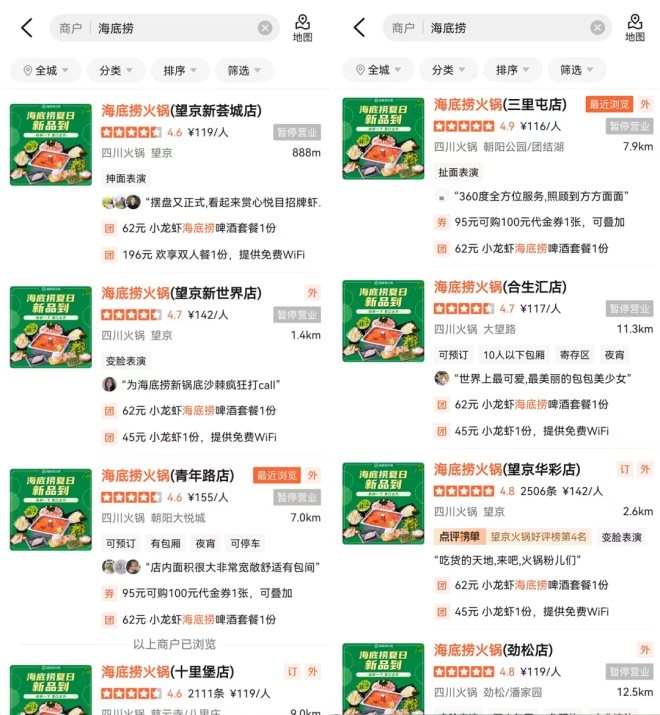 讓人更加“恐慌”的是,連海底撈這樣的巨頭品牌,也出現(xiàn)了多店“暫停營業(yè)”的情況。內(nèi)參君在大眾點評看到,望京新薈城、望京新世界、朝陽合生匯,以及三里屯、勁松、青年路等多個熱門商圈及商場店均顯示“暫停營業(yè)”。