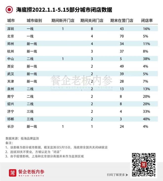 也就是說,結(jié)合去年的關(guān)店情況,從海底撈2022年上半年的閉店情況來看,可以總結(jié)出以下幾點動態(tài):