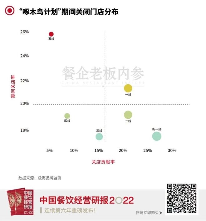 如今,這一情況繼續(xù)被驗證。如果說之前的關(guān)店潮,主要瞄準(zhǔn)五線城市,那么2022年上半年,三線、四線城市的閉店情況也不容樂觀。下表可見,閉店率超過40%的城市均為三四五線城市。