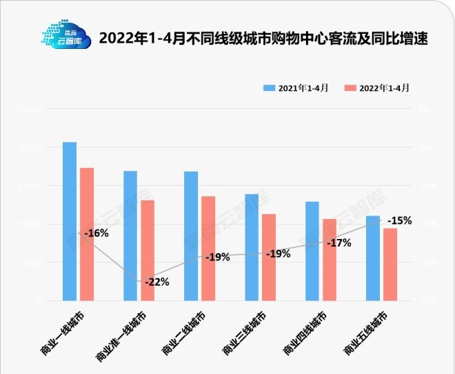 數(shù)據(jù)顯示,自2021年二季度以來,全國商場日均客流總體水平呈下降趨勢,從2021年二季度1.7萬人的峰值降至2022年一季度1.36萬人。另一方面,環(huán)比降幅不斷擴大,2022年一季度環(huán)比降幅達(dá)到13%。