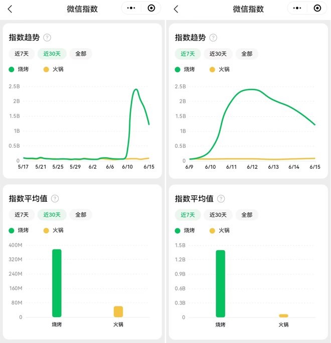而再次監(jiān)測七天以內(nèi)、以及30天以內(nèi)的數(shù)據(jù),發(fā)現(xiàn)趨勢同樣明顯,燒烤遠(yuǎn)高于火鍋。