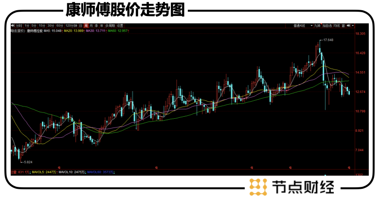今年2月底之后,康師傅的股價(jià)開(kāi)始了一輪暴跌。截至6月16日收盤(pán),其股價(jià)為12.48港元/股,相較2月23日其17.65港元/股的歷史最高點(diǎn),下跌幅度約為29.29%。