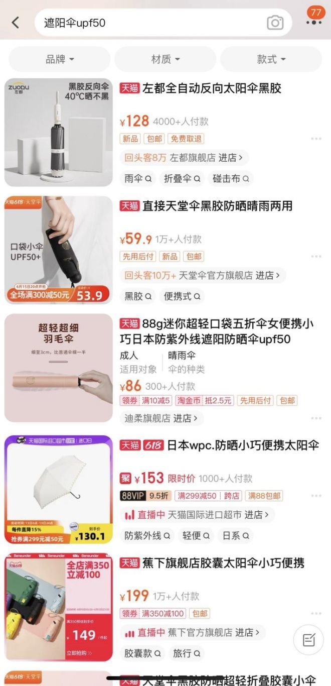 但同時(shí)具備這兩大條件的傘具并不少,在淘寶上搜索“遮陽傘UPF50”,各類品牌均有這樣的功能,而且出來的傘具幾十元、上百元的都有,與蕉下的價(jià)格差距較大。