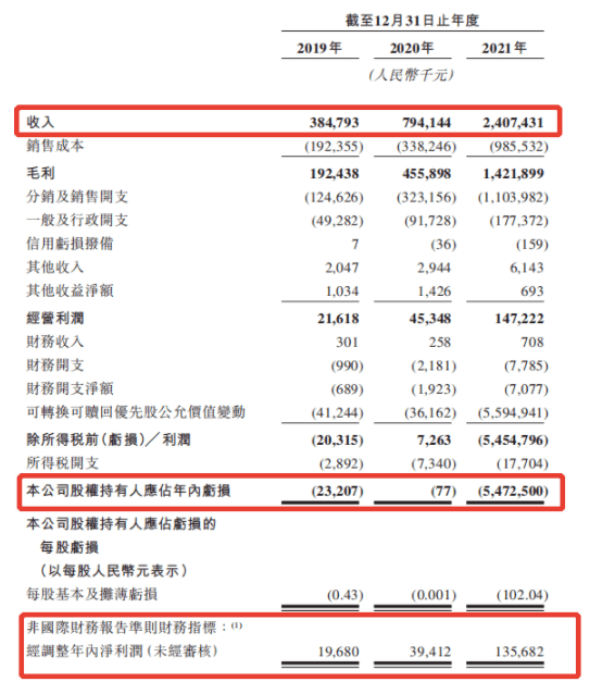 再來看蕉下的利潤表,2021年蕉下收入24億,股權(quán)持有人虧損54億,但經(jīng)調(diào)整后,凈利潤為1.36億。調(diào)整的是股份支付薪酬費(fèi)用、可轉(zhuǎn)換可贖回優(yōu)先股公允價(jià)值變動(dòng)。