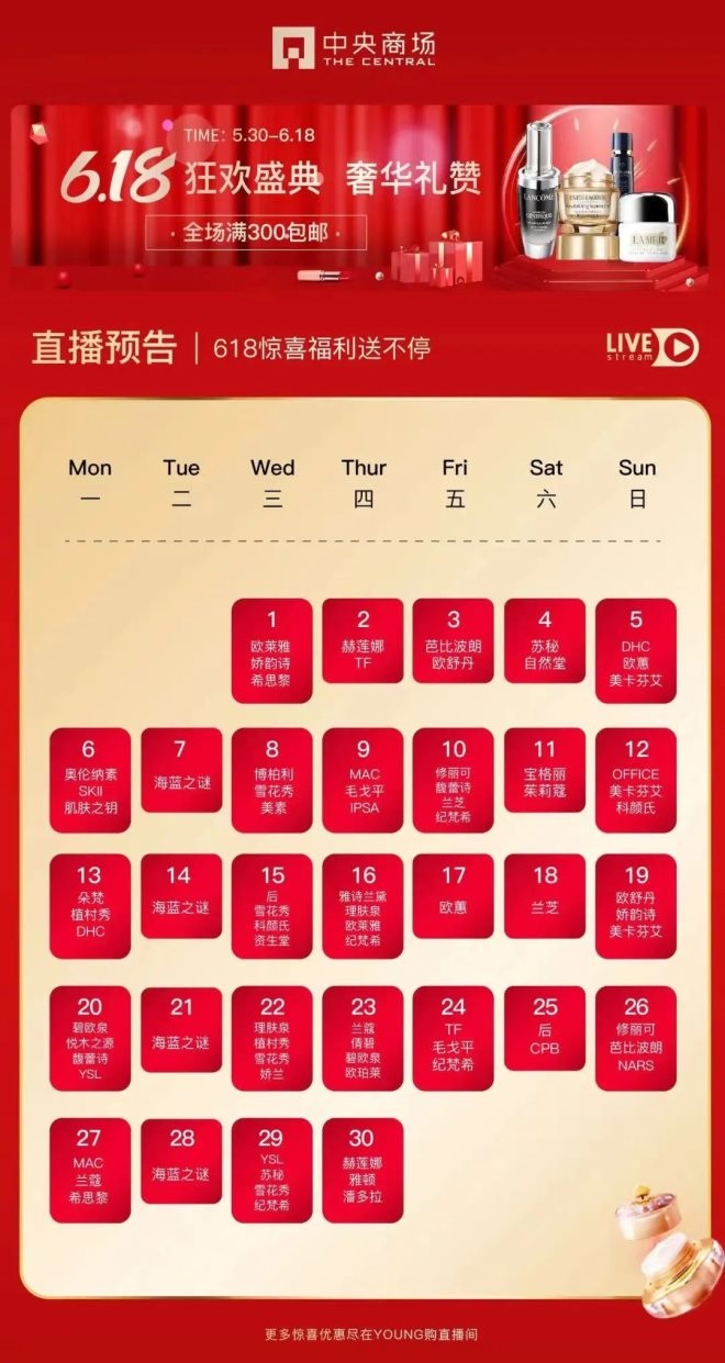 中央商場微信官方電商平臺Young購開啟“618全民購物超級品類日”,緊抓線上銷售會場,打造買的放心用的安心的專柜特惠直播間,開啟6月沖刺模式!線上下單專柜發(fā)貨/自提,大大縮短了快遞的等待時長,好物秒到手!更有中商愛寵生活上線,讓生活更美好!