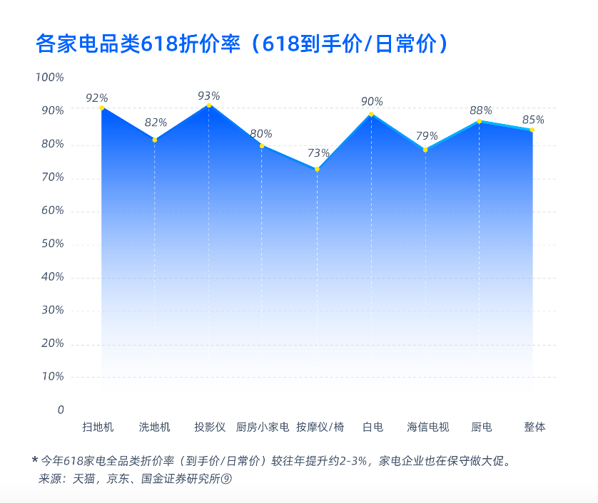 打折力度也沒(méi)有過(guò)去那么大了。國(guó)金證券的研報(bào)顯示,今年618家電全品類產(chǎn)品的整體折價(jià)率(618 到手價(jià)/日常價(jià)) 為 85%,相較往年提升約2-3%。