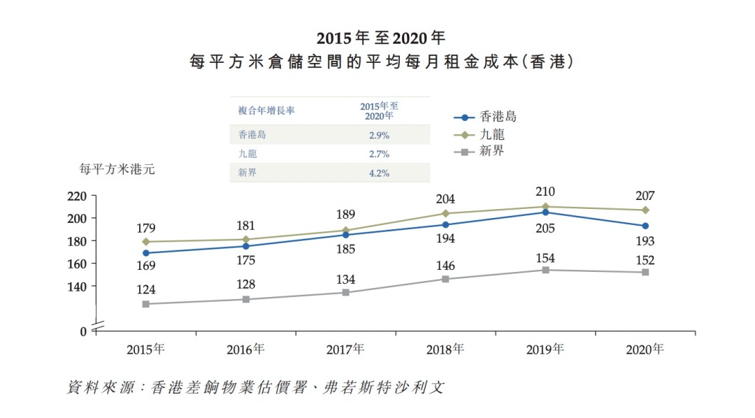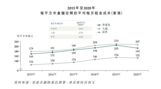 以地租成本為例,過(guò)去5年,香港倉(cāng)儲(chǔ)空間每平方米的平均月租成本年復(fù)合增長(zhǎng)率為2.7%,比如九龍地區(qū),2015年每平方米月租成本為179港元,而2020年為207港元,即每平米的年租成本在2484港元左右。對(duì)比京東物流,據(jù)2021年財(cái)報(bào)數(shù)據(jù),其倉(cāng)儲(chǔ)網(wǎng)絡(luò)總面積約2400萬(wàn)平方米,年租金約為95億元,折合每平米年租金約395元,差距昭然。