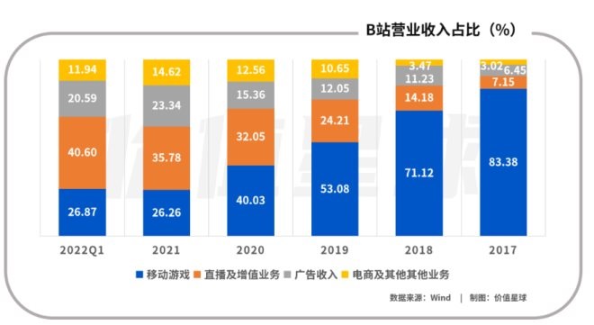除了營(yíng)收占比最高的直播及增值業(yè)務(wù),游戲成為B站第二大支柱。對(duì)比可以發(fā)現(xiàn),巔峰時(shí)移動(dòng)游戲營(yíng)收一度超過(guò)八成。資本市場(chǎng)曾戲稱(chēng)B站披著興趣社區(qū)的外衣,實(shí)則是一家游戲公司。