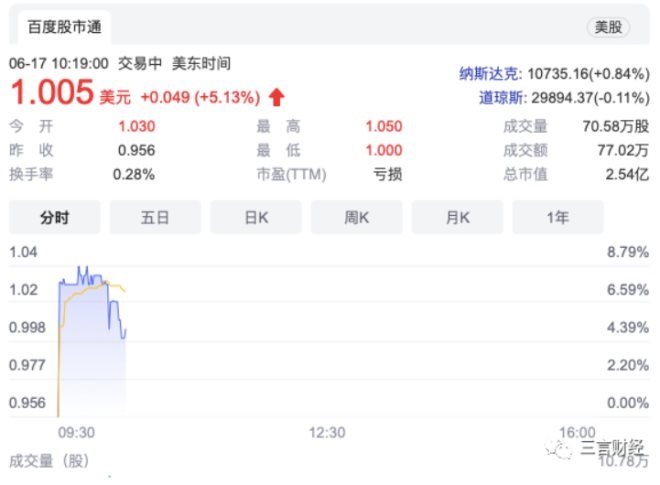 美股盤中,趣店股價最高漲幅8.79%,后有回落,截至發(fā)稿,漲幅5.13%,報1.005美元每股,總市值2.54億美元。