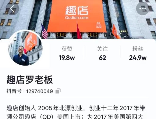 羅敏主頁的簡介里寫道:“趣店創(chuàng)始人2005年北漂創(chuàng)業(yè),創(chuàng)業(yè)十二年2017年帶領公司趣店(QD)美國上市;為2017年美國第四大IPO;2021年二次創(chuàng)業(yè)預制菜行業(yè),期望能為全球數(shù)億消費者提供方便好吃干凈的食品;也希望通過努力為人們的生活帶來一些微小而又美好的改變!