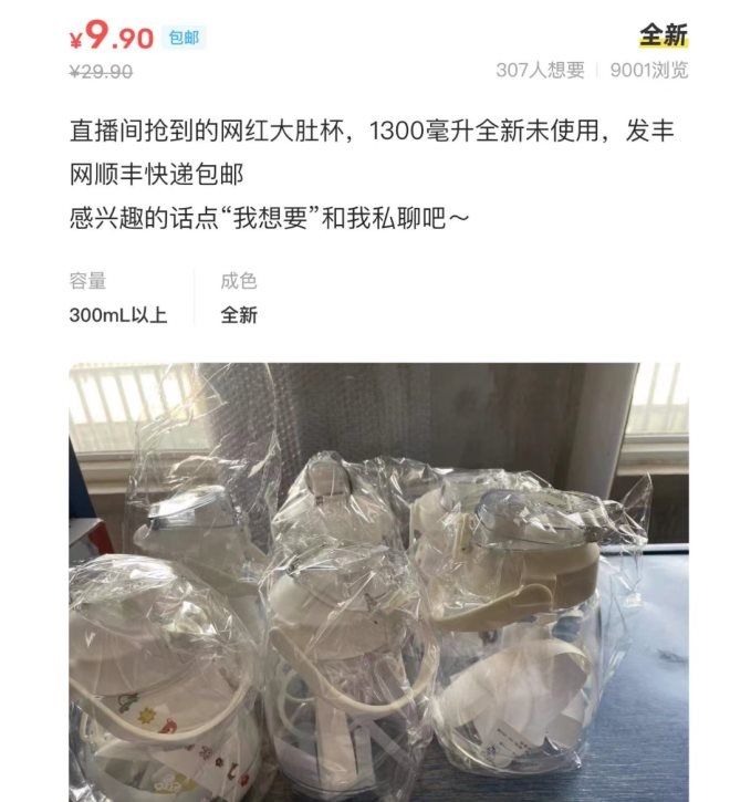社交平臺(tái)上,有網(wǎng)友表示已在多個(gè)直播間內(nèi)相繼搶到的20~30個(gè)大肚杯,也催生了大肚杯的二次倒賣。某二手交易平臺(tái)上,不少用戶拋售從直播間搶購的大肚杯。其中,有交易鏈接的想要人數(shù)307人,瀏覽量高達(dá)9000。