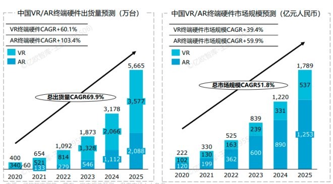 根據億歐智庫在《2021中國VR/AR產業(yè)研究報告》中的測算,2020-2025年,中國AR終端硬件出貨量將保持103.4%的年均復合增速,遠高于VR設備。預計到2025年,中國AR終端硬件出貨量將達2088萬臺。與此同時,國內AR終端硬件的市場規(guī)模也將水漲船高,達到1253億元。