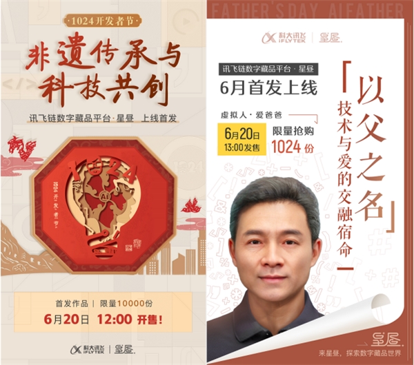 據(jù)悉,6月20日,科大訊飛【星晝】數(shù)藏平臺(tái)首發(fā)了2款藏品:一款是獻(xiàn)禮父親節(jié)的“虛擬人爸爸”形象;另一款是融合非遺剪紙共創(chuàng)的“1024開(kāi)發(fā)者剪影”。