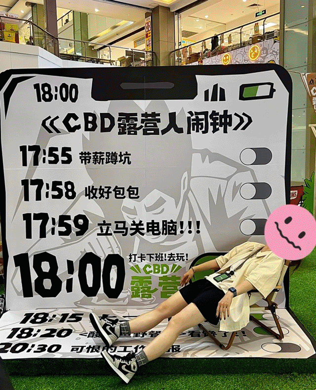 打卡點的背景墻是一個碩大的手機鬧鐘形象!17:55帶薪蹲坑,17:58收好包包,17:59立馬關電腦,18:00打卡下班,去玩CBD露營”。