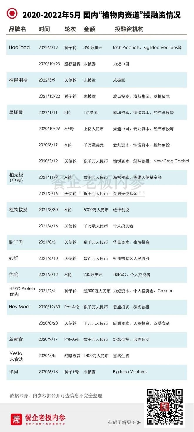 過去兩年中,國內(nèi)植物肉賽道融資超20起。其中,深圳植物肉品牌星期零4輪融資金額接近10億元人民幣。