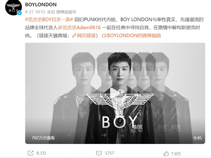 藝人營銷作為品牌的重拳出擊一直沿用至今。今年4月BOY正式官宣范丞丞成為其品牌全球代言人,還在官方微博上線了全新朋克態(tài)度大片,視頻中范丞丞展現(xiàn)自由、朋克的先鋒潮流新青年的態(tài)度。