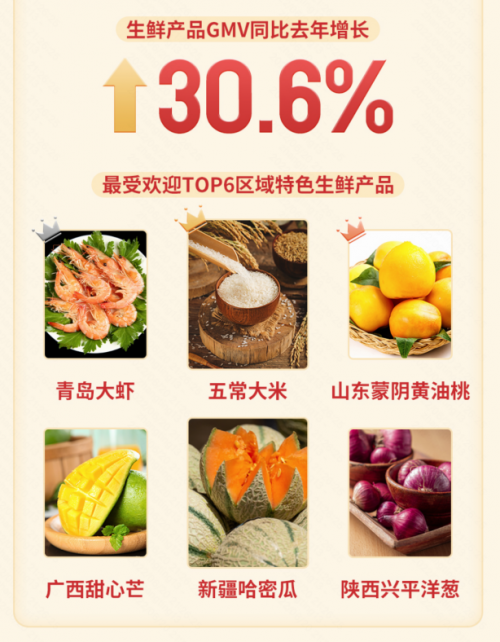 快手積極利用平臺優(yōu)勢,助力大量生鮮產(chǎn)品通過快手銷往一二線城市,實現(xiàn)農(nóng)產(chǎn)品上行。616期間,生鮮產(chǎn)品GMV同比增長超30%,其中五常大米、山東蒙陰黃油桃、新疆哈密瓜、陜西興平洋蔥等成為最受消費者喜愛的地方農(nóng)特產(chǎn),來自北京、長春、天津的消費者最愛購買農(nóng)特產(chǎn)品。