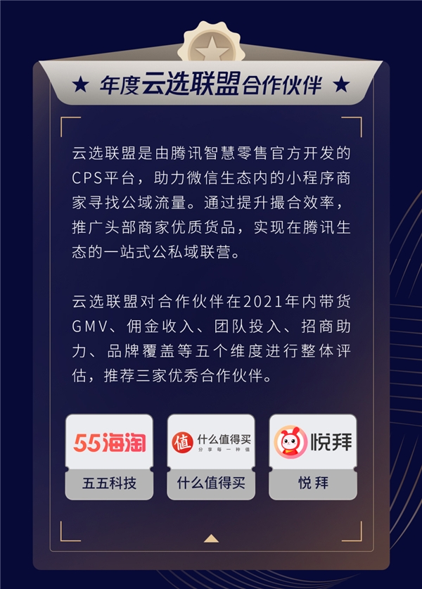 “云選聯(lián)盟”是由騰訊智慧零售官方開(kāi)發(fā)的CPS平臺(tái),旨在幫助微信生態(tài)內(nèi)的小程序商家尋找公域流量。作為騰訊智慧零售官方推薦的優(yōu)秀合作伙伴,什么值得買將通過(guò)提升撮合效率,推廣頭部商家優(yōu)質(zhì)貨品,助力騰訊生態(tài)的一站式公私域聯(lián)營(yíng)。