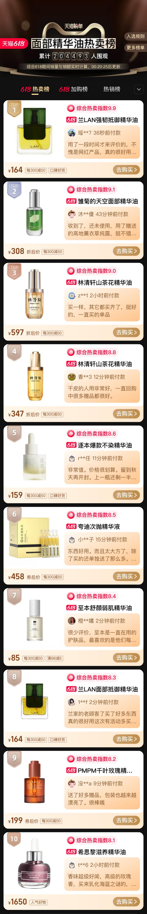 而在剛剛落幕的618大促中,林清軒山茶花油更是取得抖音電商爆款精華油排行榜第一,天貓面部爆款精華油排行榜TOP3的好成績,是榜單內(nèi)唯一超過500元單品。