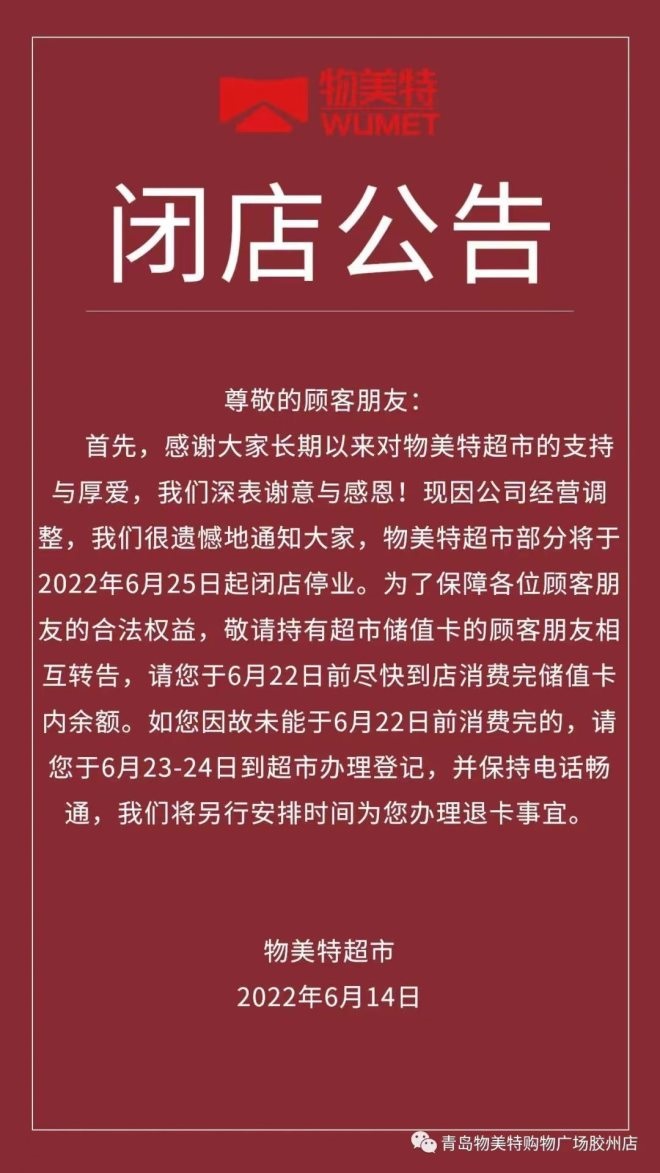 公告顯示,因公司經(jīng)營調(diào)整,物美特超市部分將于6月25日起閉店停業(yè)。為了保障各位顧客朋友的合法權(quán)益,持有超市儲值卡的請于6月22日前盡快到店消費(fèi)完儲值卡內(nèi)余額。如因故未能在6月22日前消費(fèi)完的,請于6月23日至24日到超市辦理登記,后續(xù)將安排退卡事宜。