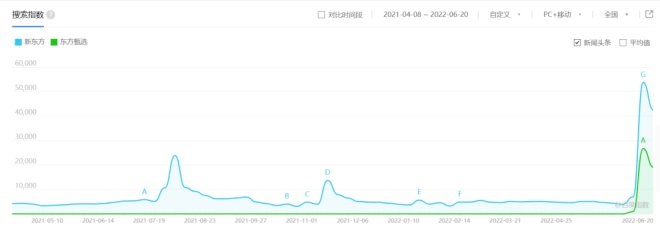 近日,以董宇輝為首的新東方老師,在直播間雙語(yǔ)賣(mài)貨再就業(yè)的事跡,火遍全網(wǎng)。根據(jù)百度指數(shù)顯示的“新東方”相關(guān)指數(shù),近日的熱度飆升,甚至超過(guò)了2021年“雙減”政策落地期間。