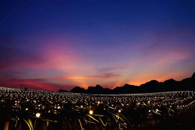 ▲夜色中,廣西南寧市隆安縣萬(wàn)畝火龍果基地?zé)艋疠x煌