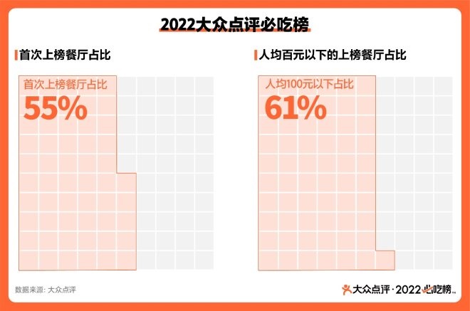 ▲2022大眾點評必吃榜首次上榜餐廳占比達55%,人均百元以下餐廳超六成,數據來源:大眾點評