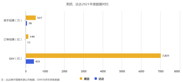 可京東憑此就能與美團(tuán)們扳扳手腕?從即時(shí)配送能力來(lái)看,達(dá)達(dá)和美團(tuán)的差距不小。2021年全年,京東到家的GMV是431億,美團(tuán)餐飲外賣分部GMV是7021億;達(dá)達(dá)承接的各類訂單規(guī)模為11億,美團(tuán)餐飲外賣訂單規(guī)模為144億。