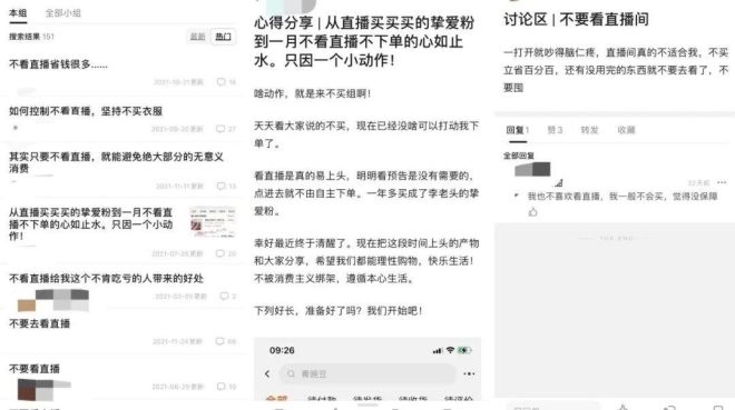 像劉茵茵一樣的友鄰很多。鋅刻度搜索發(fā)現(xiàn),有上百條跟直播相關(guān)的討論和帖子,比如“不看直播省錢(qián)很多”、“不要靠近直播間,它會(huì)讓你變得貧窮”、“只要不看直播,就能避免絕大部分的無(wú)意義消費(fèi)”、“不看直播給我這個(gè)不肯吃虧的人帶來(lái)的好處”……還有不少帖子直接命名為“不要去看直播”。