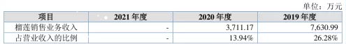 根據(jù)資料,2019年,田野股份榴蓮銷售業(yè)務(wù)收入7630.99萬元,占營業(yè)收入比例為26.28%,2020年榴蓮銷售業(yè)務(wù)收入減半,僅占營業(yè)收入的13.94%,而到了2021年,已無榴蓮銷售業(yè)務(wù)收入。