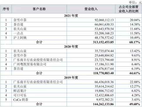 2020年,奈雪的茶一躍成為田野股份的第二大客戶,到了2021年,前五大客戶已經(jīng)被新式茶飲占據(jù)了四席,其中包括奈雪的茶、茶百道、一點點和滬上阿姨四個連鎖茶飲品牌,在總營收的占比分別為20.04%、14.38%、11.58%和10.49%。