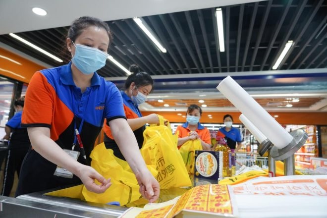▲中百倉儲門店員工正在分揀線上訂單商品(王平 攝)