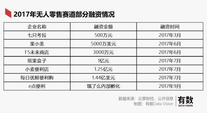 2017年,在一眾VC大佬們的攪動下,無人貨架、自動售貨機(jī)、無人便利店三大細(xì)分賽道多點(diǎn)開花,大有成為新零售“風(fēng)口”之勢。根據(jù)產(chǎn)業(yè)數(shù)據(jù),2017年下半年行業(yè)內(nèi)有30余家公司獲得了超過30億元的融資[5],論規(guī)模和速度都超越了風(fēng)頭無兩的共享單車。