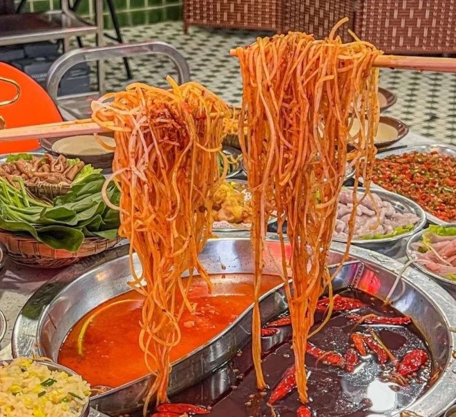同樣原理的,還有火爆火鍋圈的“瀑布土豆絲”,也是改變了土豆的常規(guī)呈現(xiàn),一道道垂天而下的“油”簾,如同瀑布一般,瀑布土豆絲堪稱鍋底的試金石,鍋底辣不辣,一試便知。
