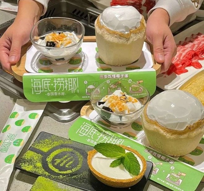 與市面上的椰子蛋產(chǎn)品不同,海底撈的新品椰子蛋主打“一椰三吃”概念,,超大一個椰子蛋,先喝椰汁,再吃椰肉,最后將椰奶菜菜倒進椰子蛋里,自制清涼補品。