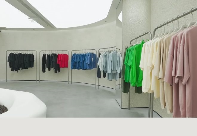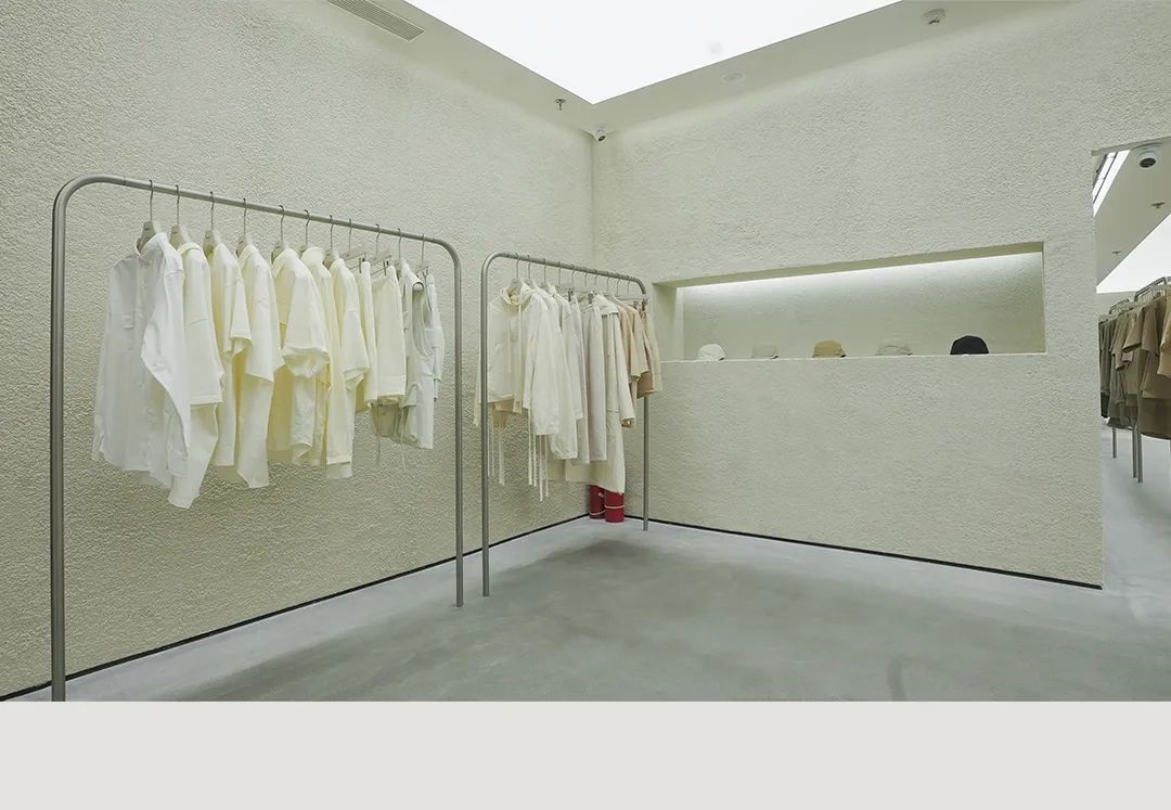 此次開業(yè)的全國首店就是以大地色作為基礎(chǔ)用色,沒有強(qiáng)沖擊力的色彩,整體突出燈光對空間氛圍的營造,并以散射偏暖光為主,讓空間整體更顯柔和。裝修材質(zhì)也是保留了原材料的生態(tài)肌理和質(zhì)感,回歸自然、簡單,與服裝材質(zhì)相呼應(yīng)。