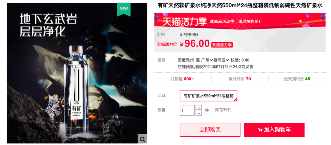 首先在產(chǎn)品營銷方面,延續(xù)了細分品類故事化。在品牌故事中,該產(chǎn)品水源來自云南原始森林深層自涌泉,經(jīng)地下深層玄武巖34年過濾,富含人體需要的鉀、鈣等微量礦物質(zhì)元素,天然弱堿性,建議4℃飲用最佳。