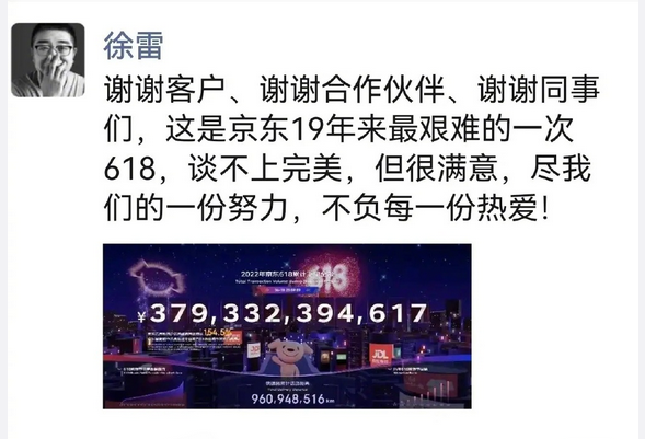 今年“618”剛落幕,京東CEO徐雷發(fā)了一條朋友圈,稱今年的618是京東19年來最艱難的一次,談不上完美,但很滿意。