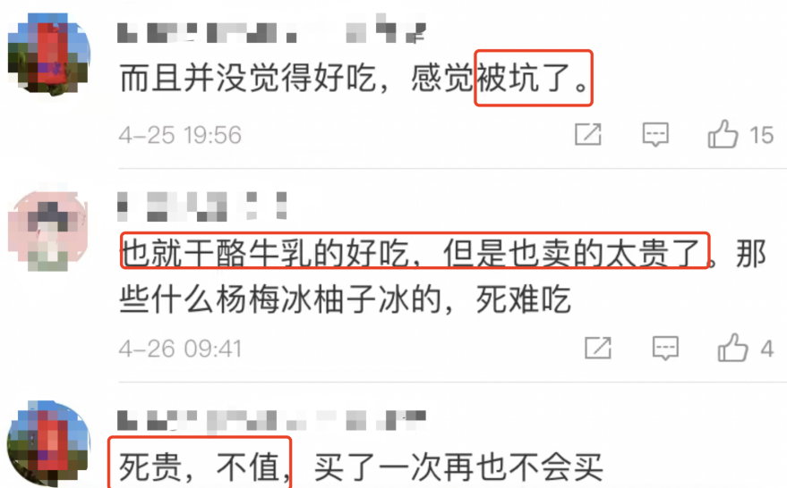 也正是因為售價過高,只要是出現(xiàn)鐘薛高的地方,就少不了網(wǎng)友們的吐槽。即便鐘薛高的部分口味得到了網(wǎng)友的認可,但更多人對該品牌的印象依然是“死貴”、感覺被坑了”。