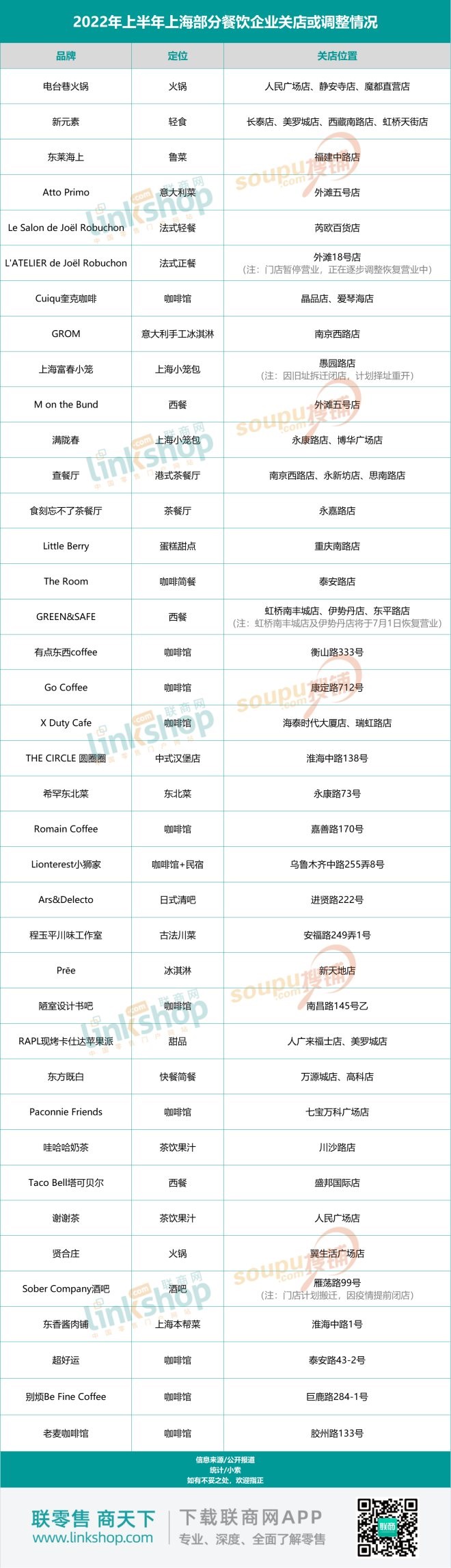 據(jù)聯(lián)商網(wǎng)不完全統(tǒng)計(jì),2022年上半年,上海至少有39家餐飲品牌、超過(guò)53家門店出現(xiàn)暫停營(yíng)業(yè)或閉店現(xiàn)象。品類涉及火鍋、咖啡、西餐、冰淇淋以及滬菜、川菜等地方菜色,其中包括電臺(tái)巷火鍋、M on the Bund、查餐廳、GROM、東萊海上等多家知名品牌。