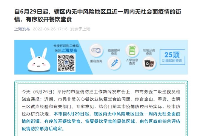 6月26日,上海市疫情防控工作新聞發(fā)布會(huì)上宣布,上海市自6月29日起,轄區(qū)內(nèi)無中風(fēng)險(xiǎn)地區(qū)且近一周內(nèi)無社會(huì)面疫情的街鎮(zhèn),有序放開餐飲堂食。