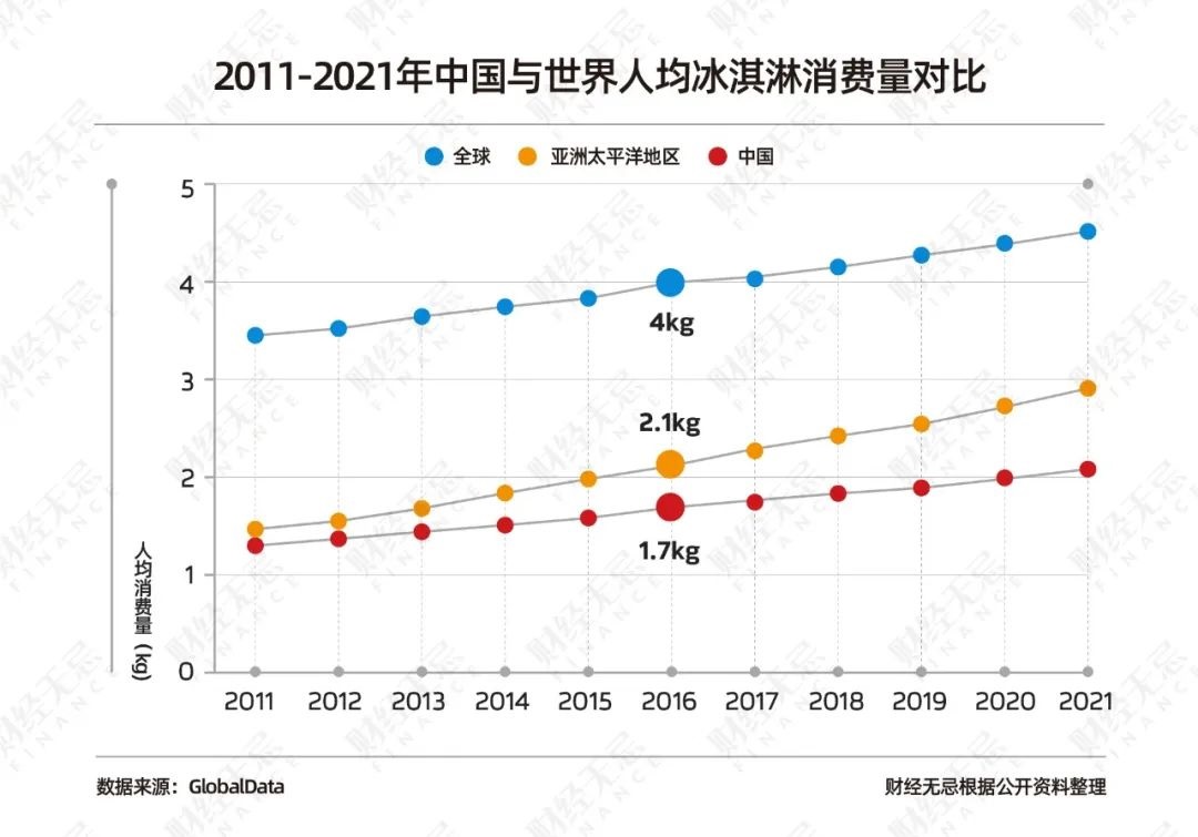 GlobalDate發(fā)布的數(shù)據(jù)顯示,2021年,中國每年人均冰淇淋消費量雖然高于亞洲太平洋地區(qū),但是僅為2.1kg。作為對比,國家統(tǒng)計局的數(shù)據(jù)顯示,目前,中國每年人均雞蛋消費量約為21kg,大米約為110kg。