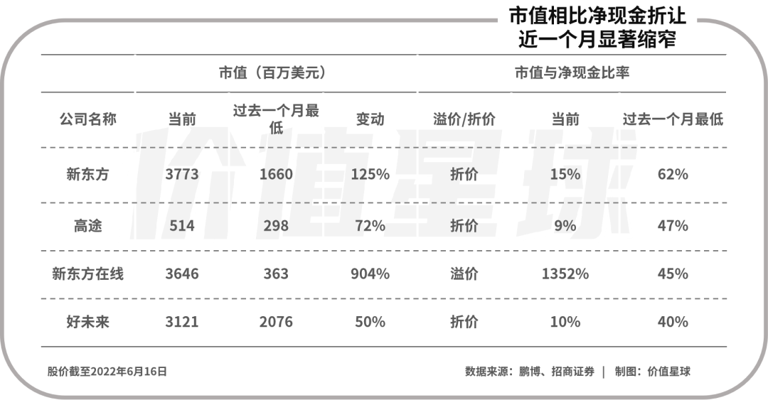 按招商證券國(guó)際的統(tǒng)計(jì),5月中旬至6月中旬,教育龍頭新東方及好未來的市值相比最近一期報(bào)告凈現(xiàn)金水平的折讓為62%及40%,而現(xiàn)在已經(jīng)縮窄到15%和10%。