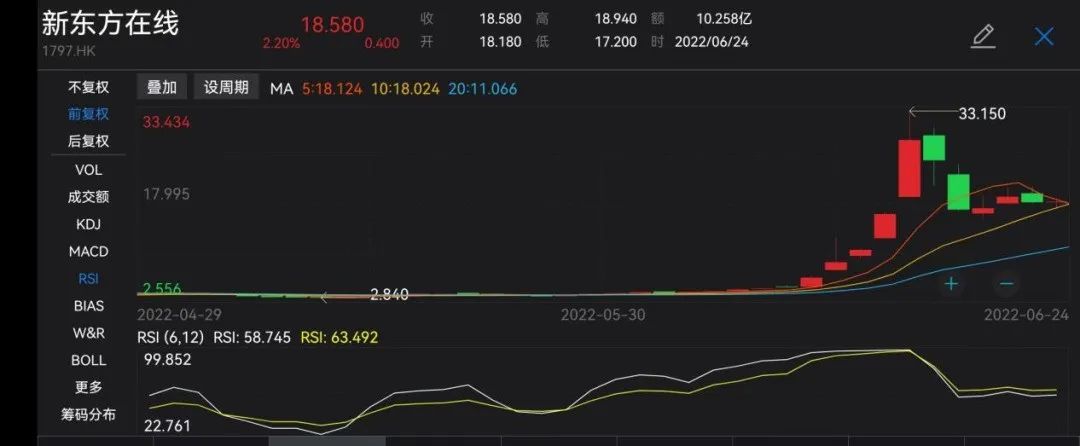 不過,從6月17日開盤,新東方在線股價(jià)開始下跌。20日-24日的一周內(nèi),新東方在線累計(jì)跌幅達(dá)到35.03%,截至24日收盤,報(bào)18.58港元/股,總市值約185.9億港元。