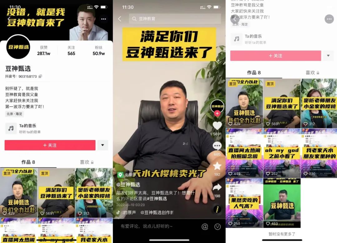 6月18日,豆神教育還推出了新賬號(hào)“豆神甄選”。短短一周時(shí)間,該賬號(hào)就已吸粉50萬。目前該賬號(hào)只發(fā)布了八條短視頻,內(nèi)容多來自于旗下其他賬號(hào)的直播內(nèi)容片段。