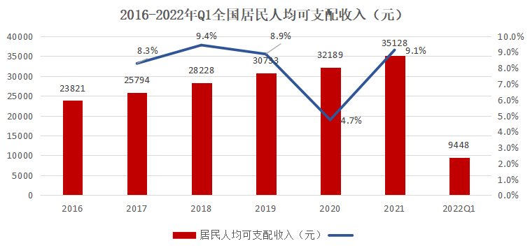 從2016年以來,我國人均可支配收入持續(xù)增長,除了2020年受疫情影響,增長的步伐有所放緩,其他年份均保持8%以上的增速。