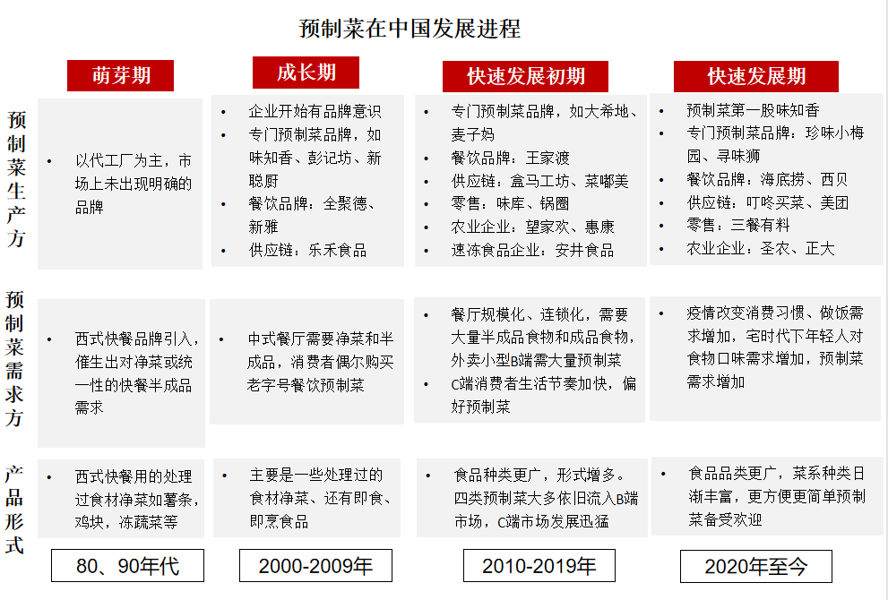 至2020 年,疫情讓消費者更加注重餐飲衛(wèi)生健康,隔離居家生活促使更多消費者進入廚房,預制菜在C 端消費市場萌芽發(fā)展。